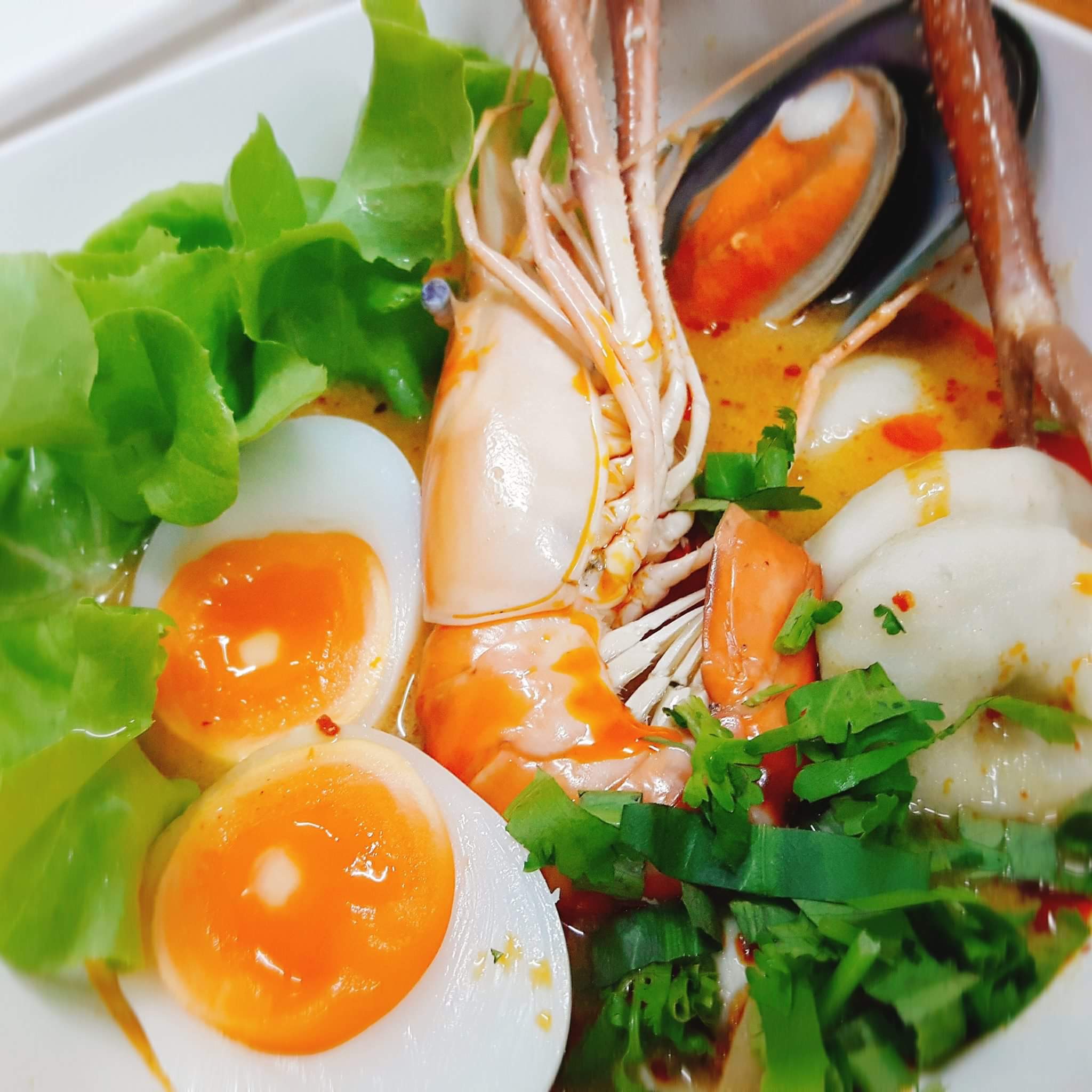 ผมสั่ง เส้นเล็กต้มยำ ไม่ปรุงอะไรเพิ่ม ชอบน้ำต้มยำ รสเข้มข้นหอมอร่อย กุ้งสด เนื้อแน่น หอยแมลงภู่นิวซีแลนด์ตัวใหญ่ ลูกชิ้นปลาไม่คาว ทานกับไข่ต้มยางมะตูม 1 ลูก อิ่มอร่อยกำลังดี