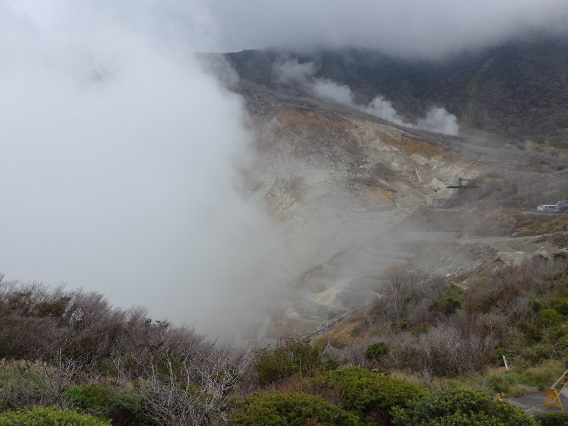 ออกจาก Museum เราขึ้นรถไฟไปต่อ รถรางเคเบิ้ลคาร์ เพื่อขึ้นไปสถานี Sounzan บน ยอดเขาที่ระดับความสูง 761 เมตร จากสถานี Sounzan นั่งกระเช้าไฟฟ้า (Rope-way) เพื่อไปเที่ยวที่สำคัญของ Hakone อีกสองจุด แวะที่สถานี Owakudani กลิ่นกำมะถันลอยมาแต่ไกล ออกไปเดินยืดเส้นสาย ซื้อไข่ต้มกินให้อายุยืนอีก 7 ปี นั่ง
