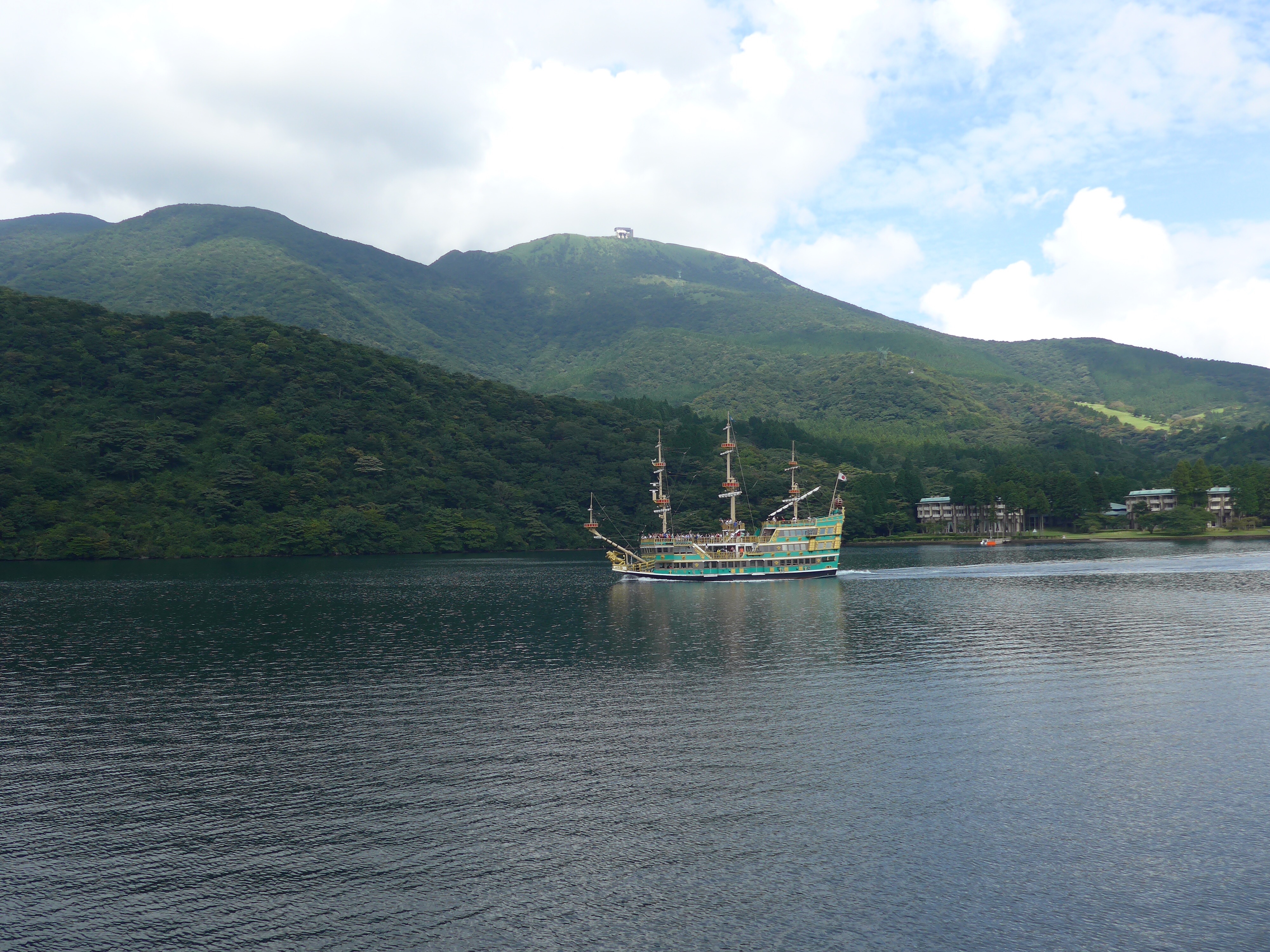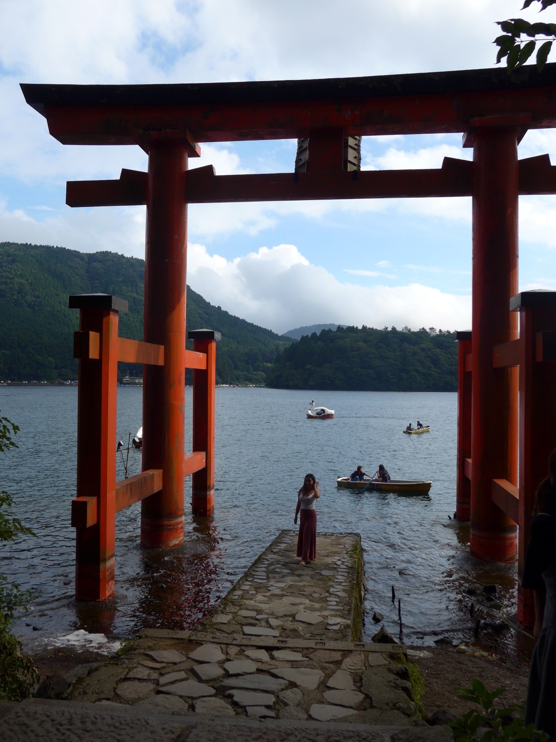 กระเช้าต่อไปลงที่สถานี Togendai แล้วนั่งเรือล่องทะเลสาบ Ashinoko (芦ノ湖) ลงเรือที่ Moto-Hakone เดินไปถ่ายรูปซุ้มประตูสีแดง torii gates ที่วัด Hakone Jinja Shrine 箱根神社 แล้วนั่งรถเมล์กลับมาที่ สถานีรถไฟ Hakone