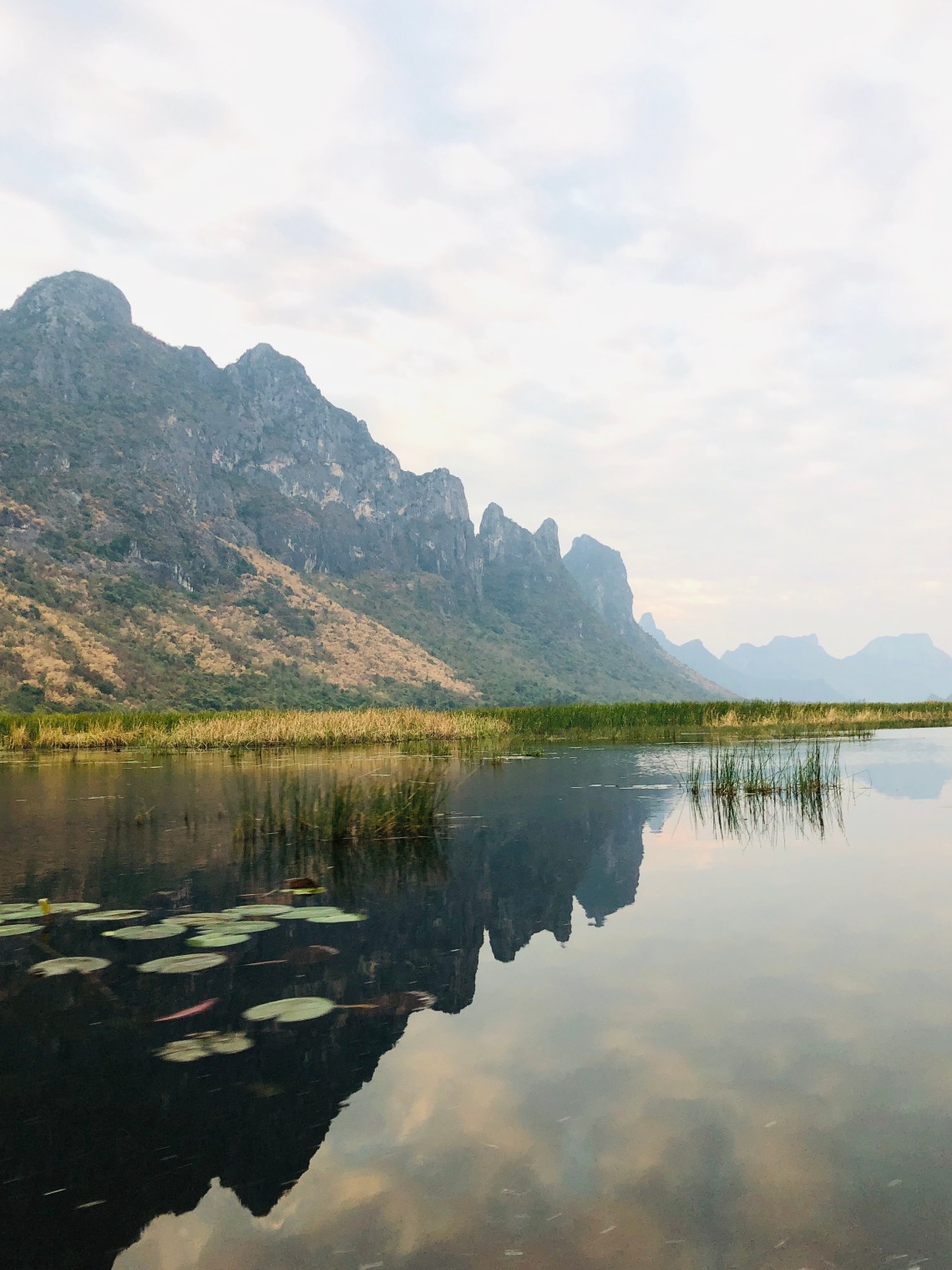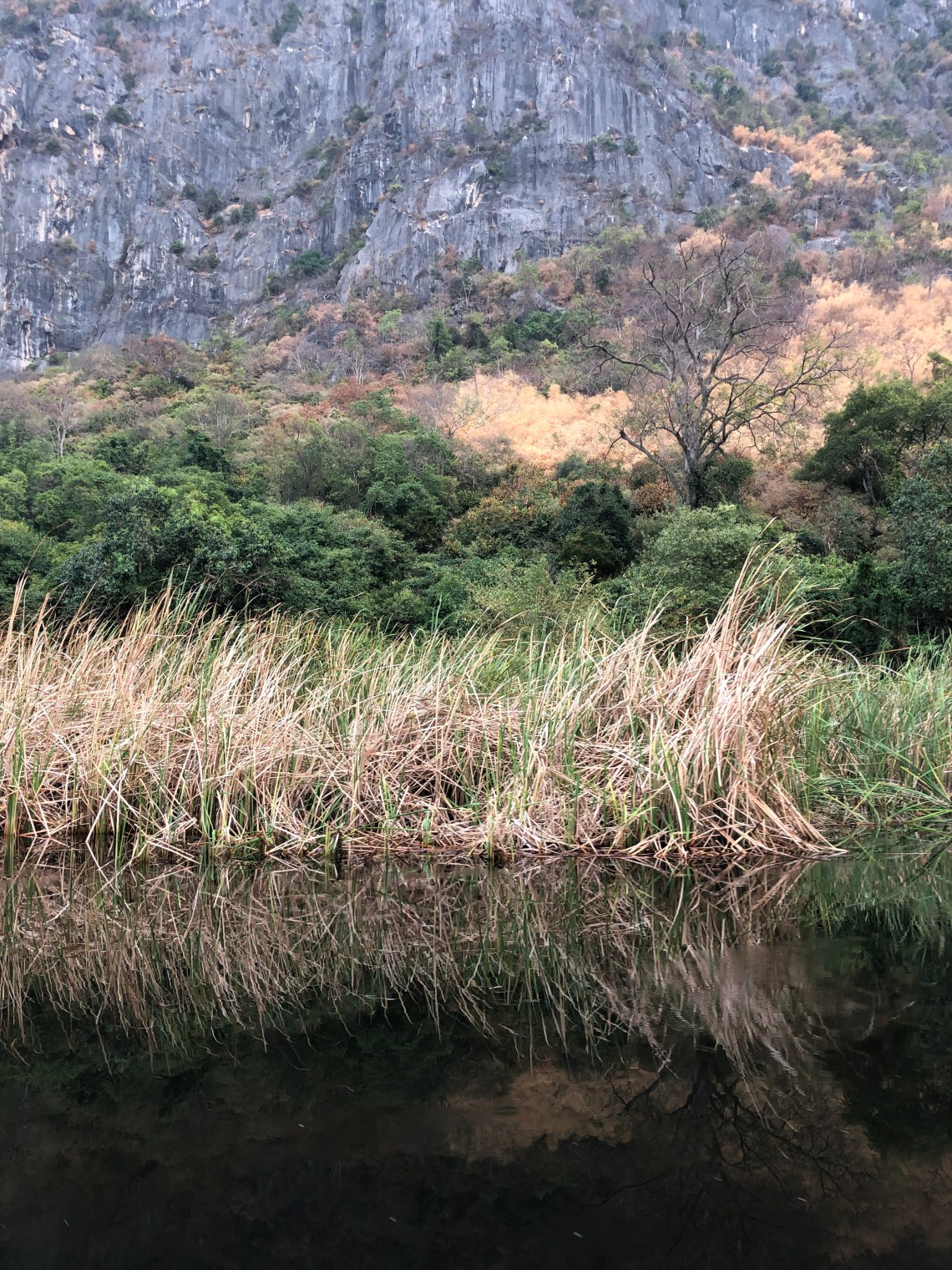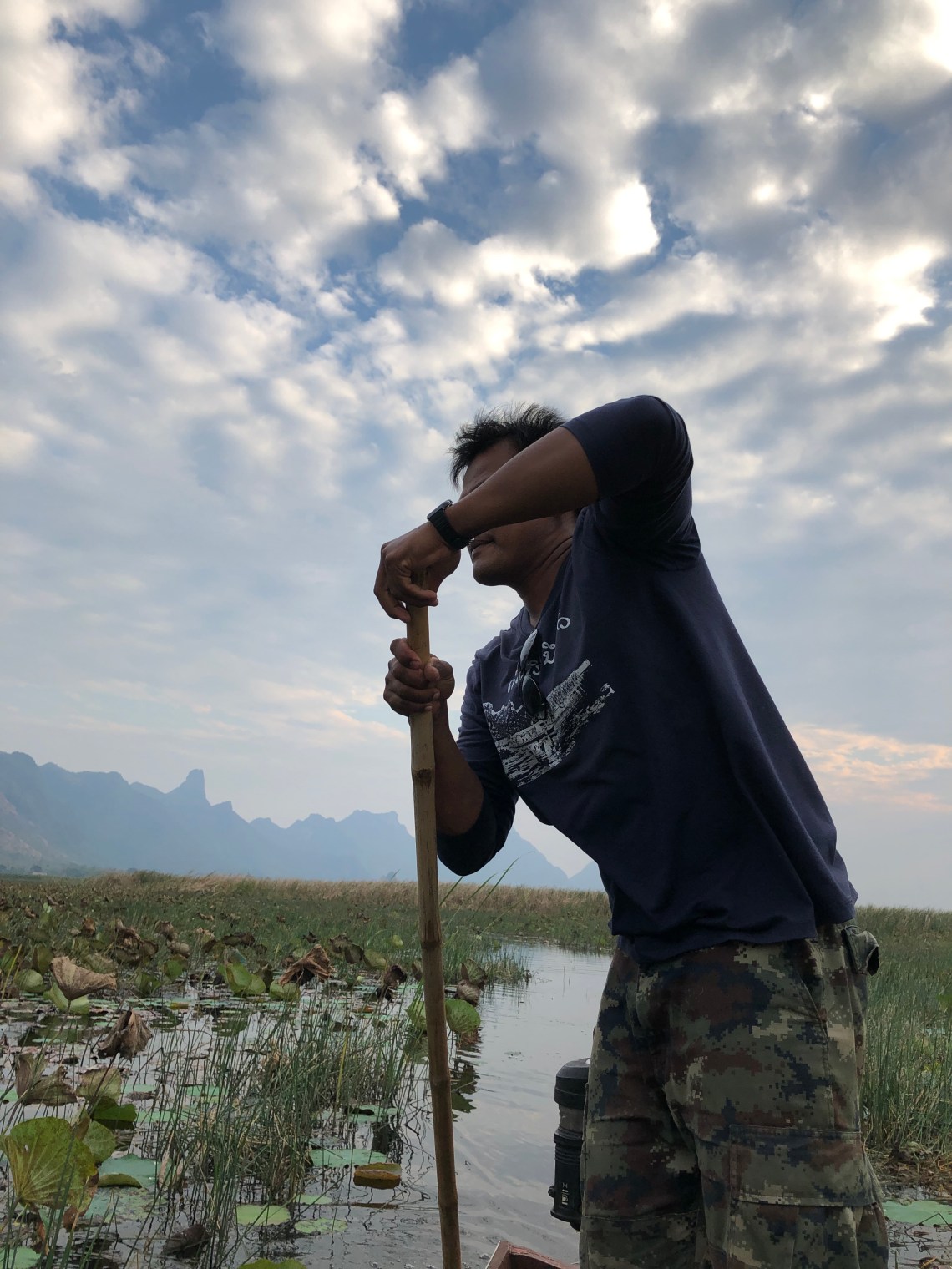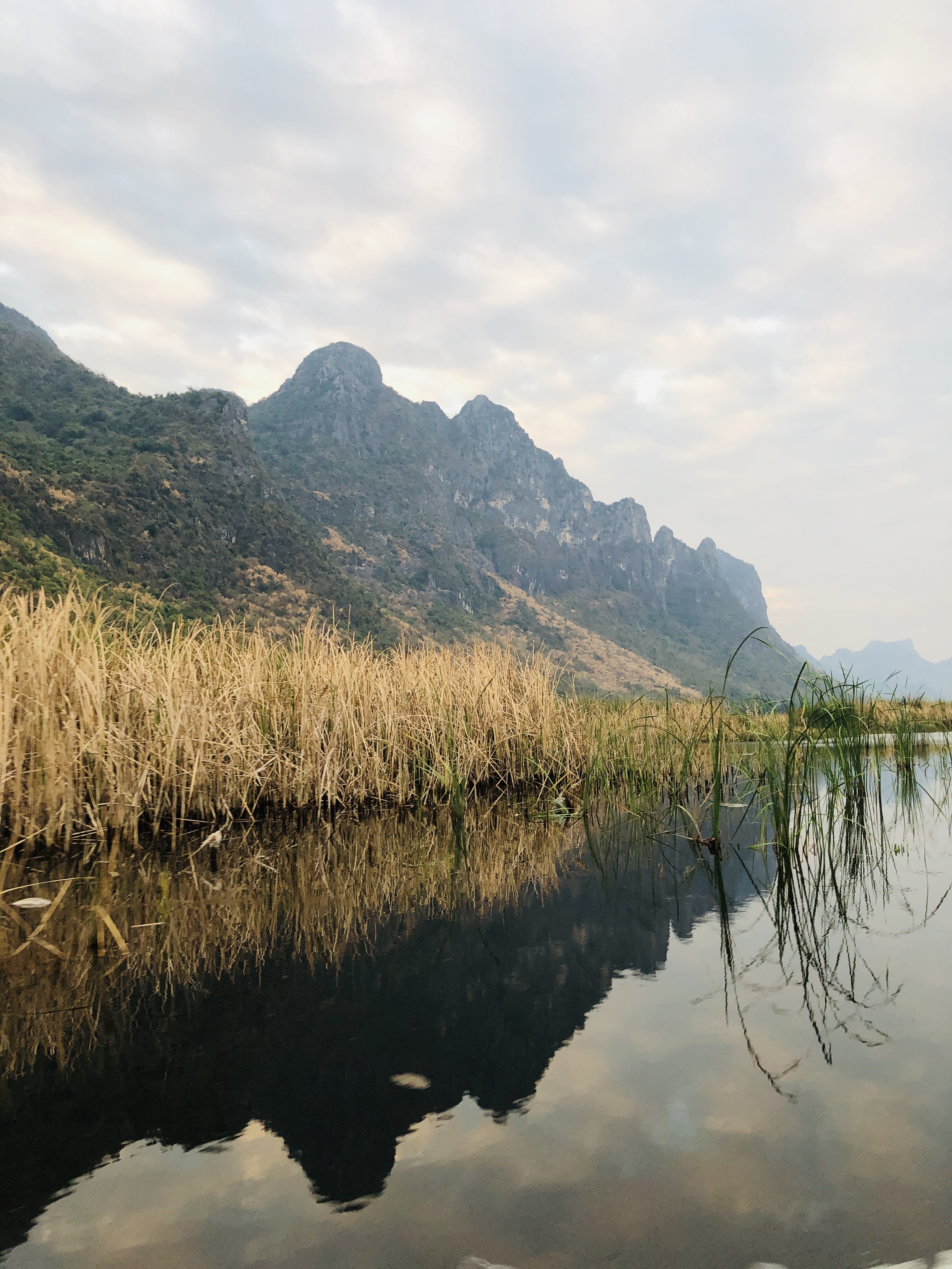 เมื่อมาถึงทุ่งโล่ง คนเรือดับเครื่องยนตร์ ปล่อยเรือลอยนิ่งบนผิวน้ำ ตั้งใจให้เราได้ยินเสียงลมทักทายกอหญ้า เสียงนกคุยกันจอแจ ข้างหน้าเราเป็นทิวเขาสูงตระหง่าน ไล่ระดับสวยงาม ทอดยาวสุดลูกหูลูกตา