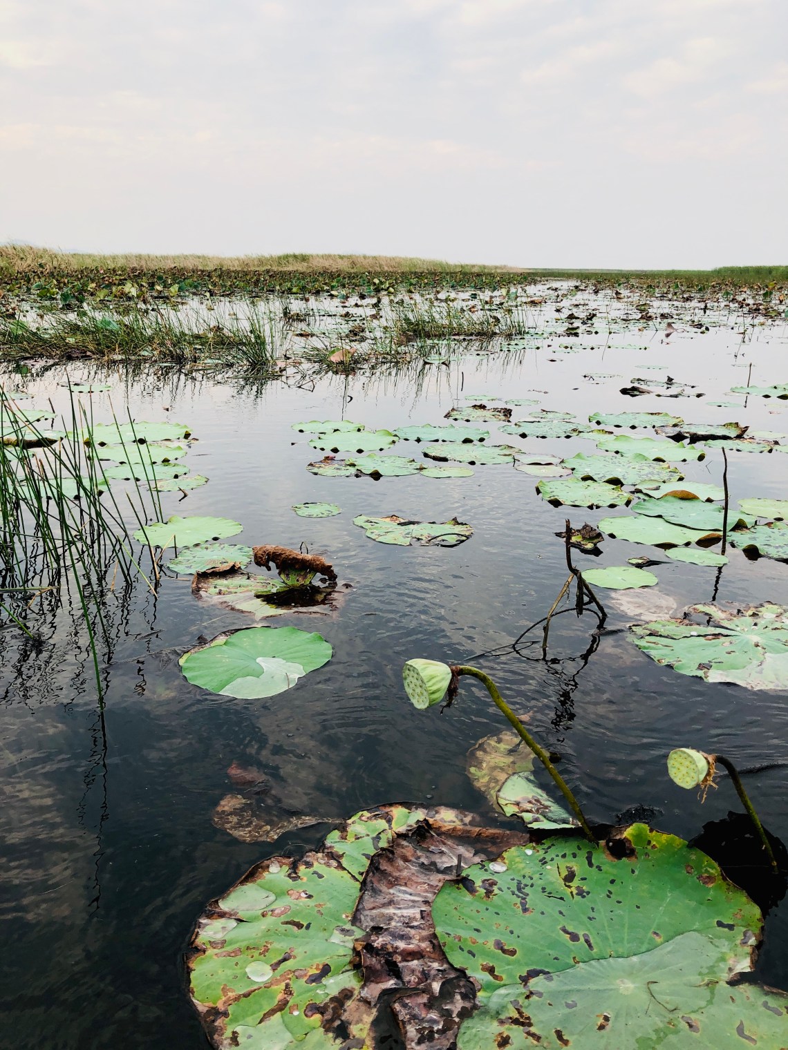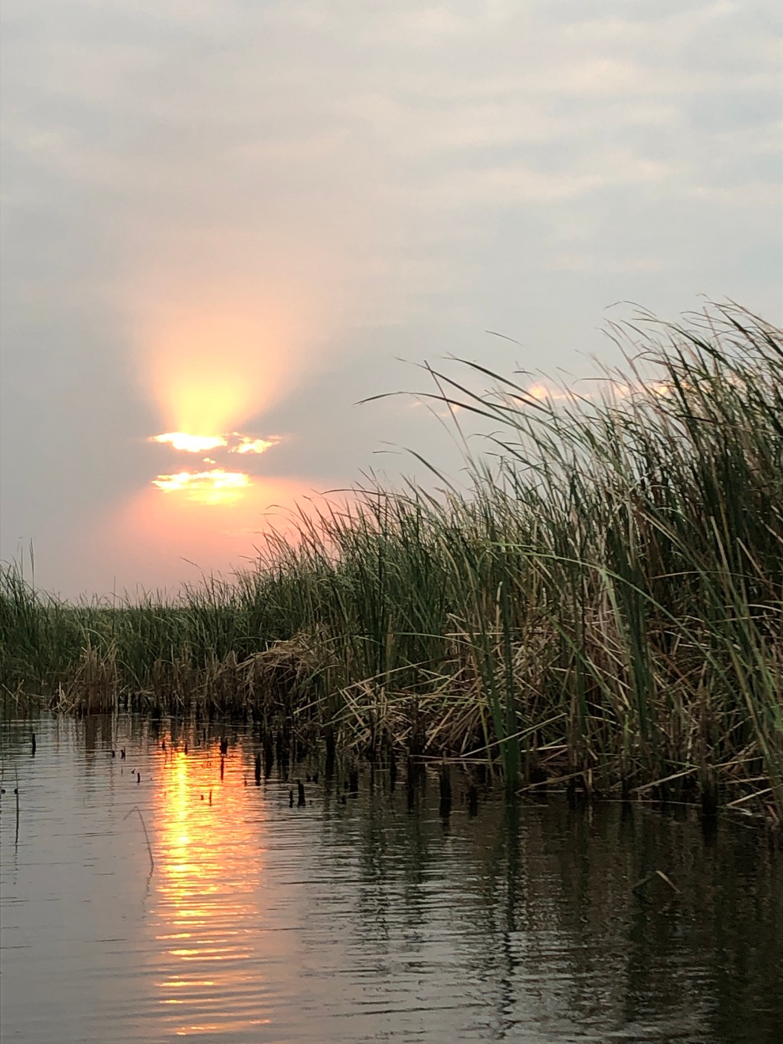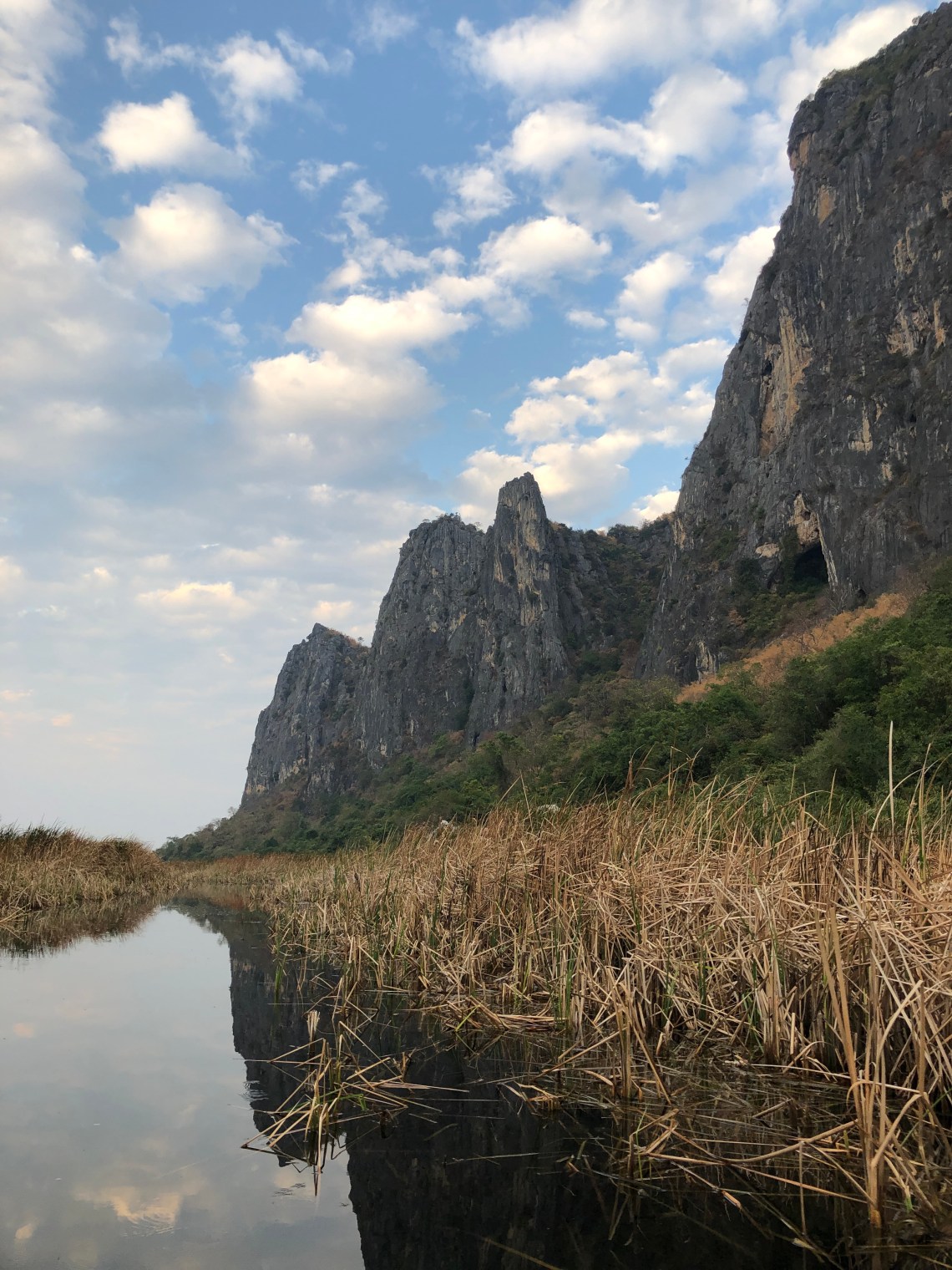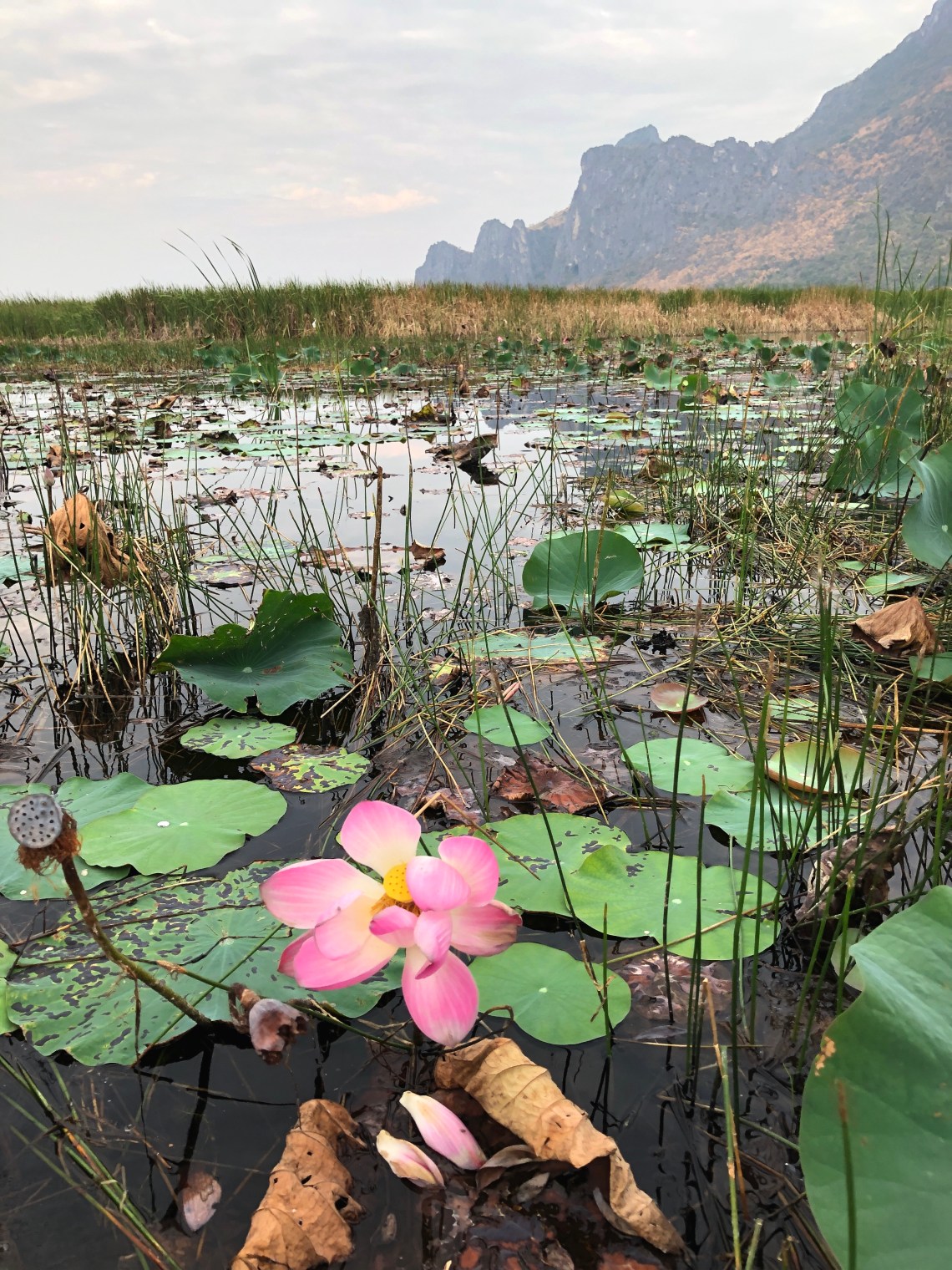 เมื่อมาถึงทุ่งโล่ง คนเรือดับเครื่องยนตร์ ปล่อยเรือลอยนิ่งบนผิวน้ำ ตั้งใจให้เราได้ยินเสียงลมทักทายกอหญ้า เสียงนกคุยกันจอแจ ข้างหน้าเราเป็นทิวเขาสูงตระหง่าน ไล่ระดับสวยงาม ทอดยาวสุดลูกหูลูกตา