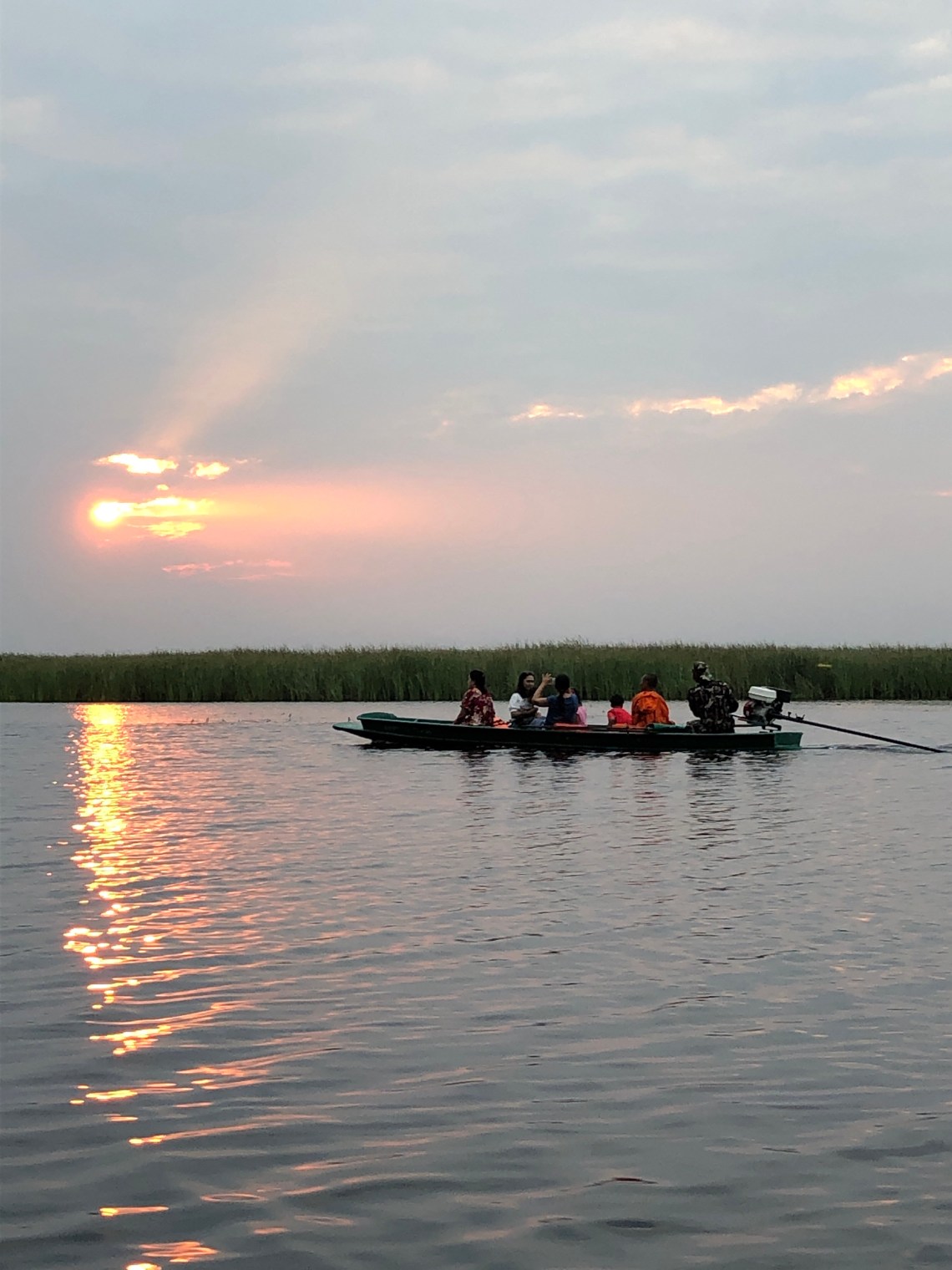 ถึงเวลา พระอาทิตย์ตก คนเรือ พาเรือมาหยุดจอดนิ่งที่จุดชมวิว ให้เราได้เห็นดวงอาทิตย์กลมโต ค่อยเคลื่อนตัวลงต่ำหาแผ่นดิน