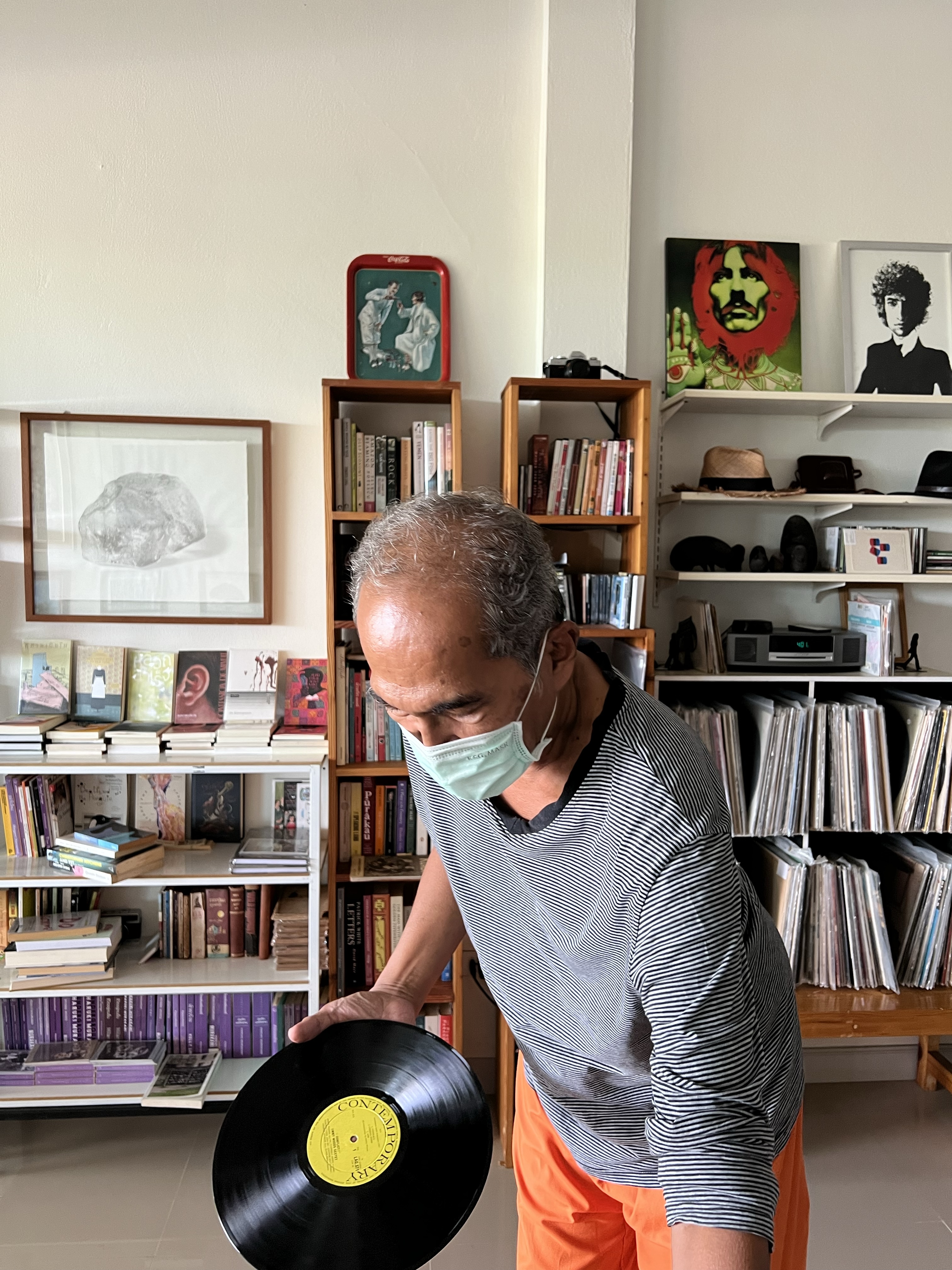 เริ่มแรก ผมตั้งใจจะไปเลือกหนังสือกลับมาอ่านที่บ้านสักสอง สามเล่ม แต่เมื่อเดินเข้าไปในร้าน Rhythm and Books นอกจาก หนังสือ ภาพเขียน รูปถ่าย ผมเห็นเครื่องเสียง และ แผ่นเสียงจำนวนหนึ่ง